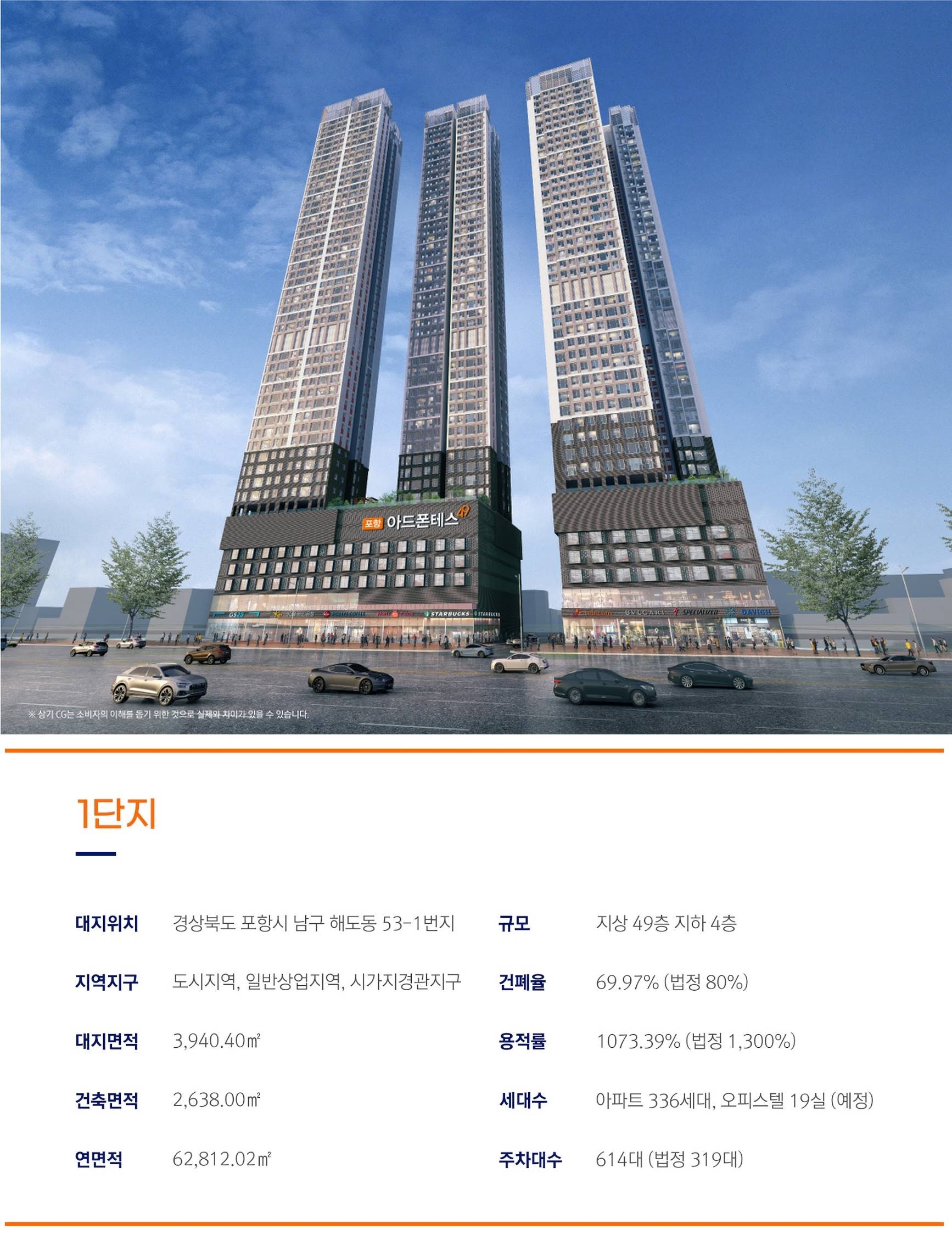 지상 최고 49층으로 설계된 2개 동의 주상복합단지로 포항 지역에서 보기 드문 웅장한 스케일과 상징성을 갖춥니다.